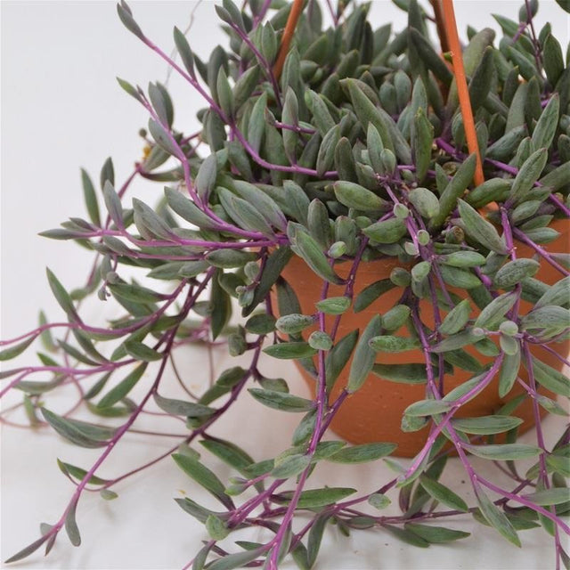 Die Othonna capensis Ruby Necklace ist eine außergewöhnliche Sukkulente, die mit ihren intensiven Farben und hängenden Trieben begeistert. Ihr Name – „Rubin-Kette“ – beschreibt schon das auffälligste Merkmal: lange, herabhängende Ranken in leuchtendem Purpur-Rot, die mit schmalen, sukkulenten Blättern besetzt sind. Besonders in Hängeampeln oder auf Regalen entfaltet sie ihre ganze Schönheit und bringt Farbe und Lebendigkeit in jedes Zuhause.